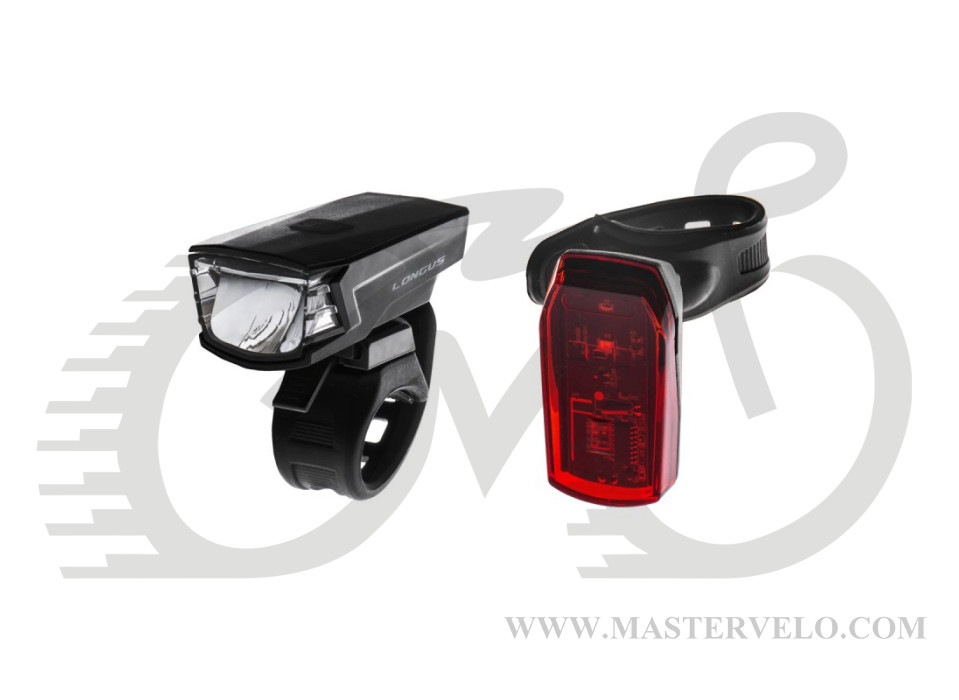 КОМПЛЕКТ: Світло Longus SINGLE переднє+заднє 1+1LED, 2ф-ції/2ф-ції, USB/батарейка, чорний 398590