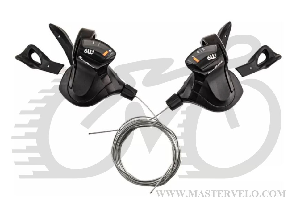 Ручки переключения SUN RACE M900, совмещенные с тормозной ручкой под 2 пальца. Предназначены для горных велосипедов с двумя звёздами спереди и девятью сзади. Работают с механическими дисковыми и ободными тормозами V-brake. Обеспечивают быстрое и точное переключение скоростей, а также мощное торможение. Имеют чёткий, легкочитаемый индикатор.