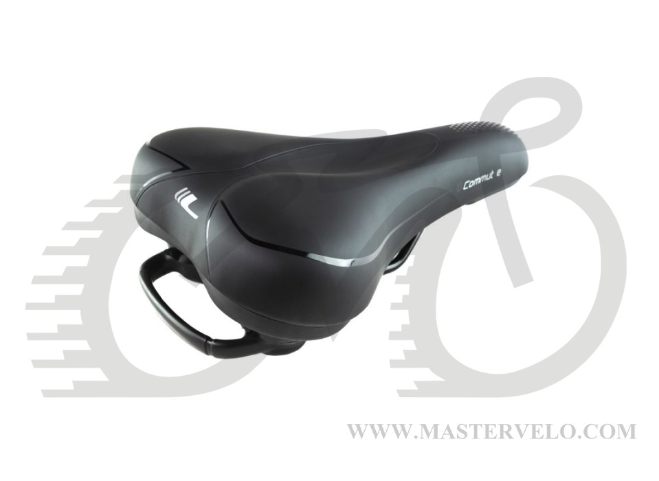 Зручне сідло COMUT-E призначене для комфортної їзди в міських умовах та на легкій місцевості. Відмінний комфорт забезпечується подвійною пружинною системою, де більшість вібрацій поглинається внутрішньою пружинною, а рівновага зовнішнім еластомером. Еластомер покриває пружину. Частиною системи є також ручка, яка забезпечує зручне зчеплення з велосипедом. Опущений середня частина зменшує тиск в області між сідничними кістками. Міцний верх запобігає ковзанню на сідлі під час їзди. Сталеві рейки збільшують термін служби сідла.
