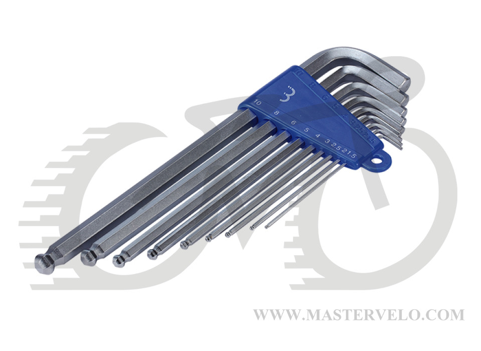 Набор из девяти L-образных шестигранников BBB (BTL-118) Шарообразный конец для труднодоступных болтов и прямой конец на коротком плече для высоких моментов затяжки. Сделаны из высококачественной инстументальной стали.