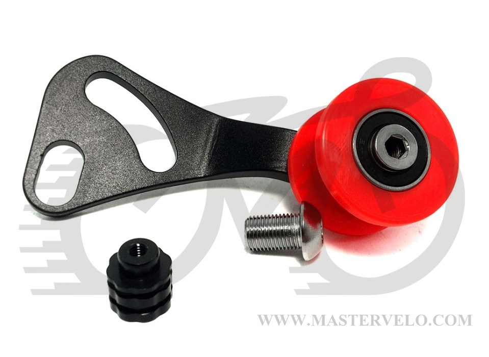 Натяжитель цепи велосипеда X17 SSP-FOOT-1 с одним красным роликом на промподшипнике для установки вместо заднего переключателя. Натяжение осуществляется путем установки нужного угла натяжителя и фиксации этого положения болтом.