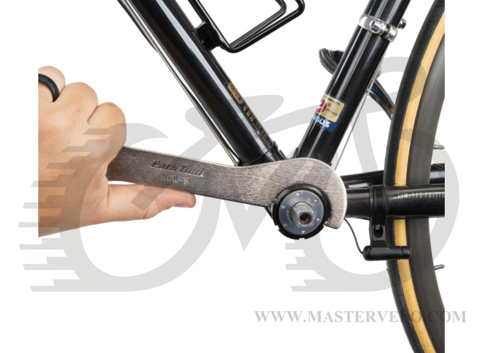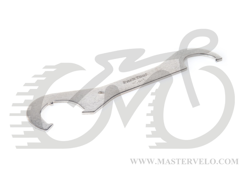 Двосторонній гачкоподібний інструмент Park Tool HCW-5 для демонтажу/монтажу стопорних кілець кареток. На одній стороні ключа знаходиться одинарний гачок, а на протилежній — гачкоподібний ключ з трьома пазами для стопорного кільця з максимальним діаметром 46 мм і мінімальним (у виїмці) 40 мм.