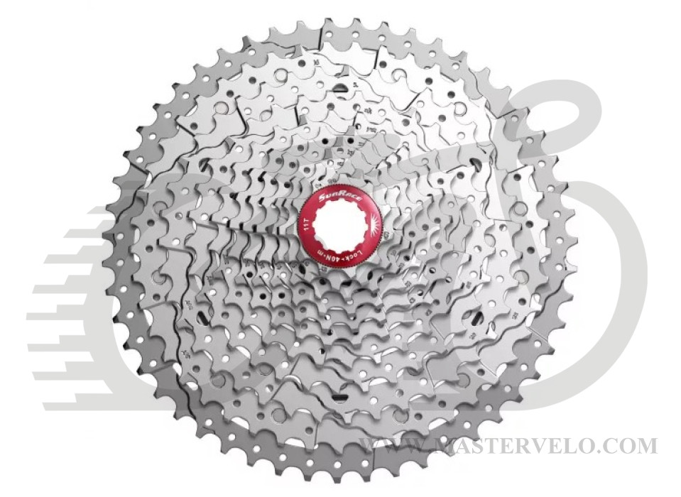 Касета високого рівня від компанії SUN RACE має полегшений дизайн і збільшені зірки, для більшої прохідності велосипеда і можливості заїжджати на крутіші пагорби. Підходить для використання з гірською та гравійною трансмісією на х11 передач. Конструкція з високоміцної сталі забезпечує надійну і довгу експлуатацію. Виконана із застосуванням поліпшеної технології Fluid Drive Plus, яка забезпечує їй відмінну роботу в сухих і вологих умовах при будь-яких навантаженнях. Основа касети має форму павука, завдяки чому менше втрачається потужність педалювання, зменшується вага, а барабан втулки менше зношується. Зірки сумісні з будь-якими ланцюгами на 11 швидкостей. Високоякісне порошкове покриття Metallic Silver захищає від корозії, подовжуючи касеті термін служби.