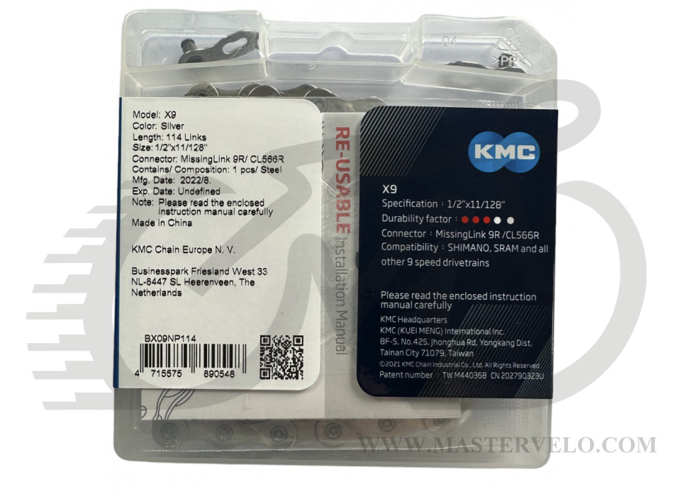 Производитель: КМС. Данная цепь относится к классу узких цепей. Может использоваться на горных  или дорожных велосипедах, которые оснащены 9 скоростной трансмиссией. KMC X9 отличается специальной "X"-образной конструкцией поверхности внешней пластины, это улучшает плавность переключения передач. Имеет особую обработку поверхности звеньев, что повышает эффективность ее работы.