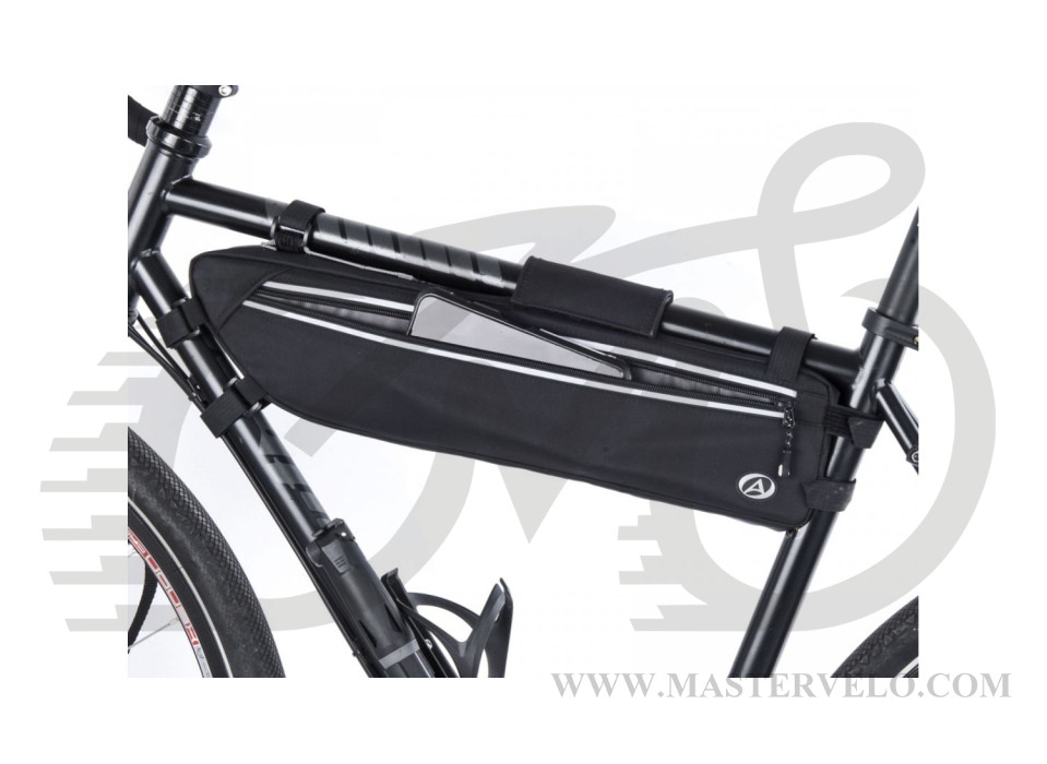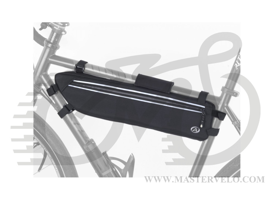 Довга сумка від AUTHOR A-R260 ProLongX24 кріпиться під верхню трубу рами, має універсальну застібку Velcro і відмінно фіксується в верхньому трикутнику рами, має два відділення. Призначена для тривалого використання. Універсальна та міцна фіксація на липучках. Окрема кишеня на блискавці для мобільного телефону, гаманця, посвідчення особи тощо. Можливість сховати  бігунок при закритті блискавки. Світловідбиваючі елементи.
