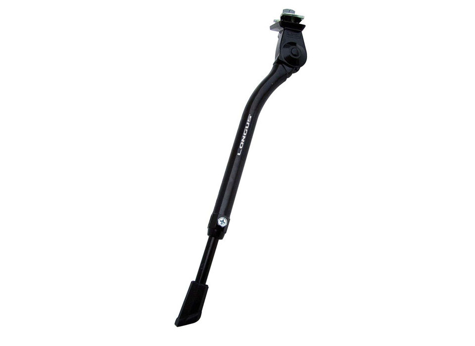 Подножка имеет функцию изменения длины и предназначена для велосипедов с размерами колес 22-28", устанавливается в центре рамы, может использоваться для велосипедов с дисковыми тормозами, имеет универсальное крепление, изготовлена из алюминия, черная.