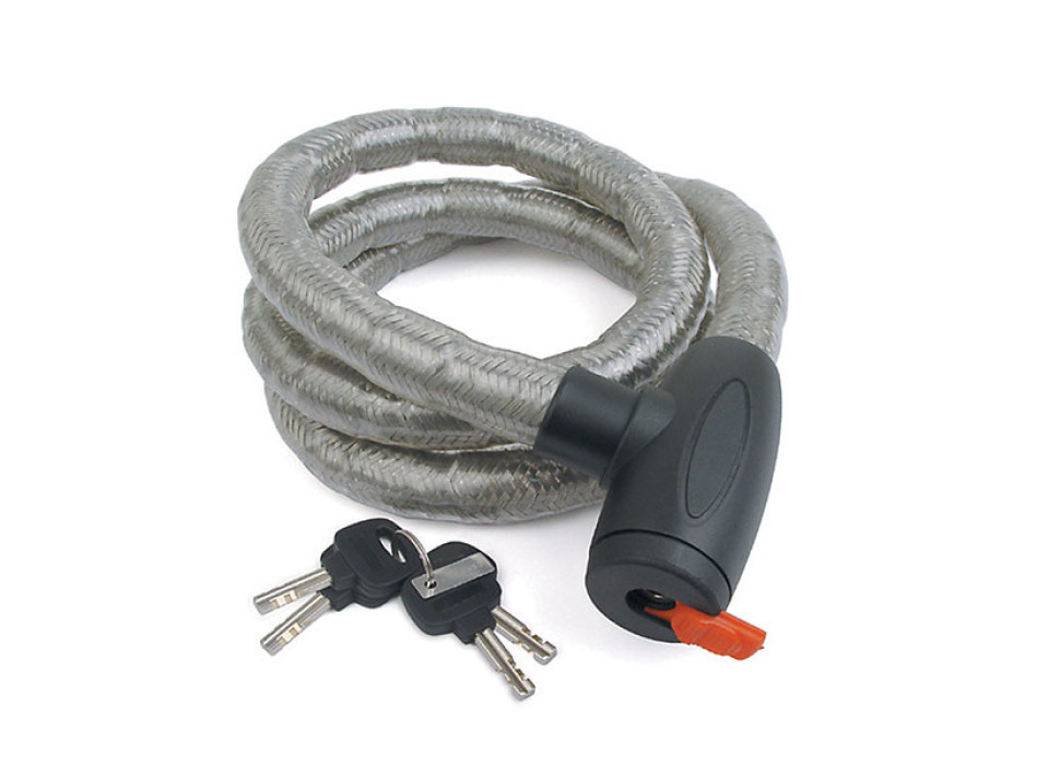 Замок A-39 закрывается на ключ , стальной тросс имеет спиральную форму длинной 1500 мм и диаметром 22 мм, замок имеет затвор предохраняющий замочную скважину от попадания грязи и воды.
