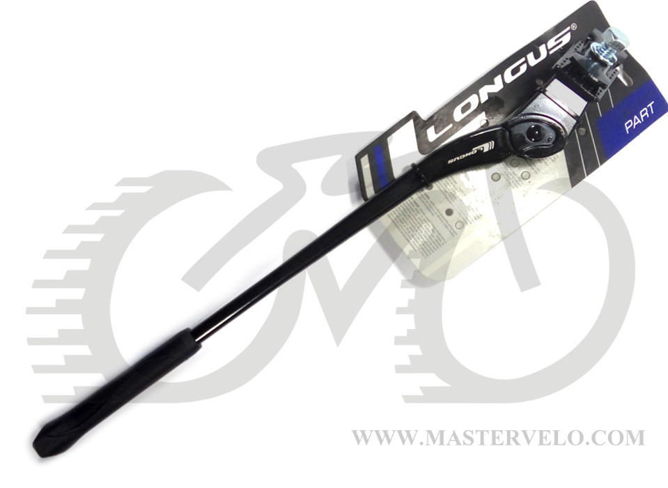Подножка имеет функцию изменения длины и предназначена для велосипедов с размерами колес 24-28", устанавливается в центре рамы, может использоваться для велосипедов с дисковыми тормозами, имеет универсальное крепление, изготовлена из алюминия, черная.