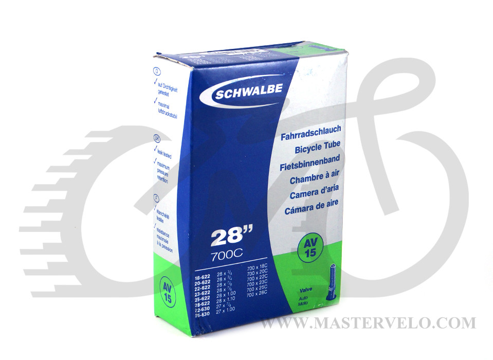 Велосипедная камера Schwalbe. Диаметр колеса: 28". Объем: 18-28 С. Тип нипеля: автомобильный (Schrader), длиной 40 мм.