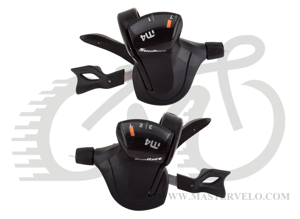 Легкие ручки переключения SUN RACE M400/M403 триггерного типа. Триггерная манетка – это блок, располагающийся на руле рядом с ручкой, содержащий храповой механизм и два рычага. Одним рычагом цепь перемещается в одну сторону, другим – в обратную. Предназначены для использования на горных либо же дорожных велосипедах, которые имеют 3 звезды спереди и 7 сзади. Конструкция манеток достаточно удобна для использования их даже в жестком кросс-кантри.