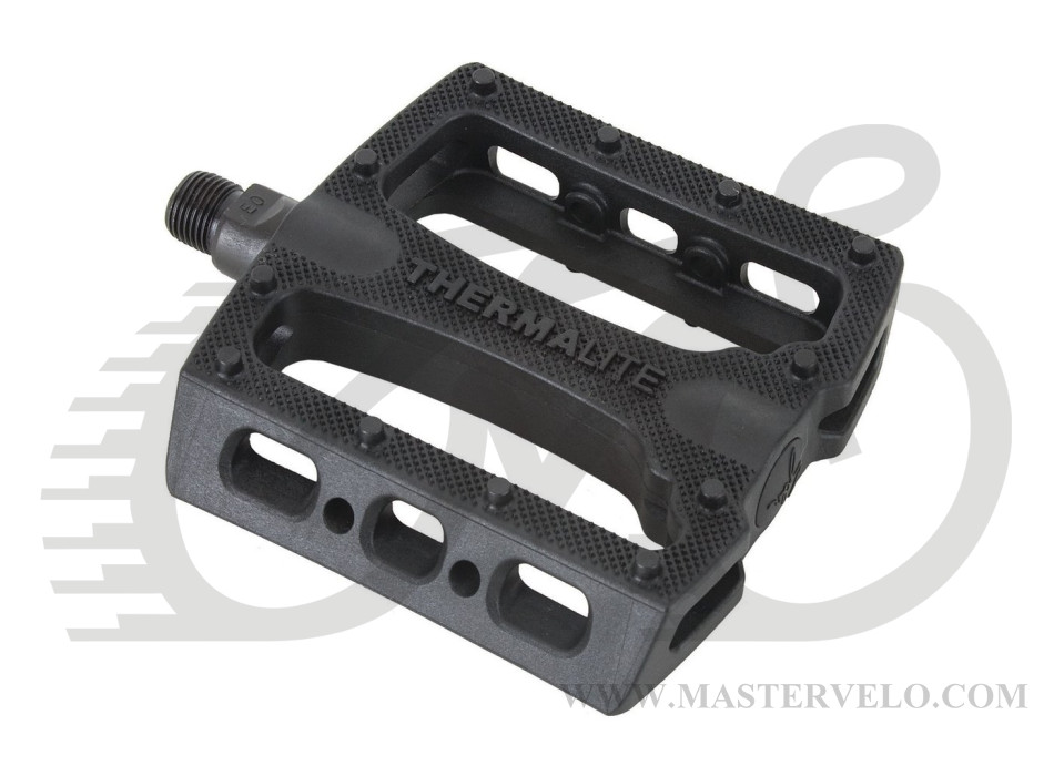 Легкие и прочные педали выполнены из материала Thermalite - сплав нейлона и стекловолокна. Хорошо держат ногу, но наносят меньшие повреждения при ударе в сравнении с обычными металлическими "топталками". Ось из хромолибдена.