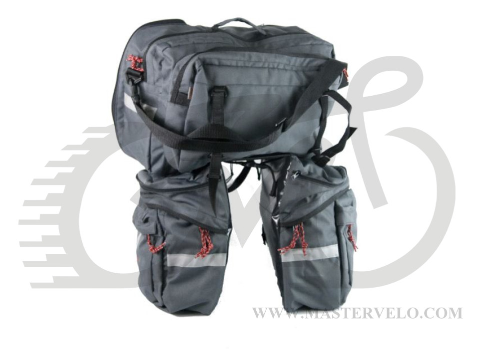 Велосумка состоит из трех больших отделений. Верхняя часть съемная и может использоваться как отдельная сумка на плечо, что позволяет комбинировать объем велосумки в зависимости от потребностей. Боковые части со стороны колеса усилены специальной пеной и обшиты легкомоющимся винилом.