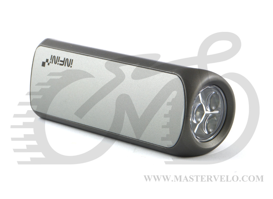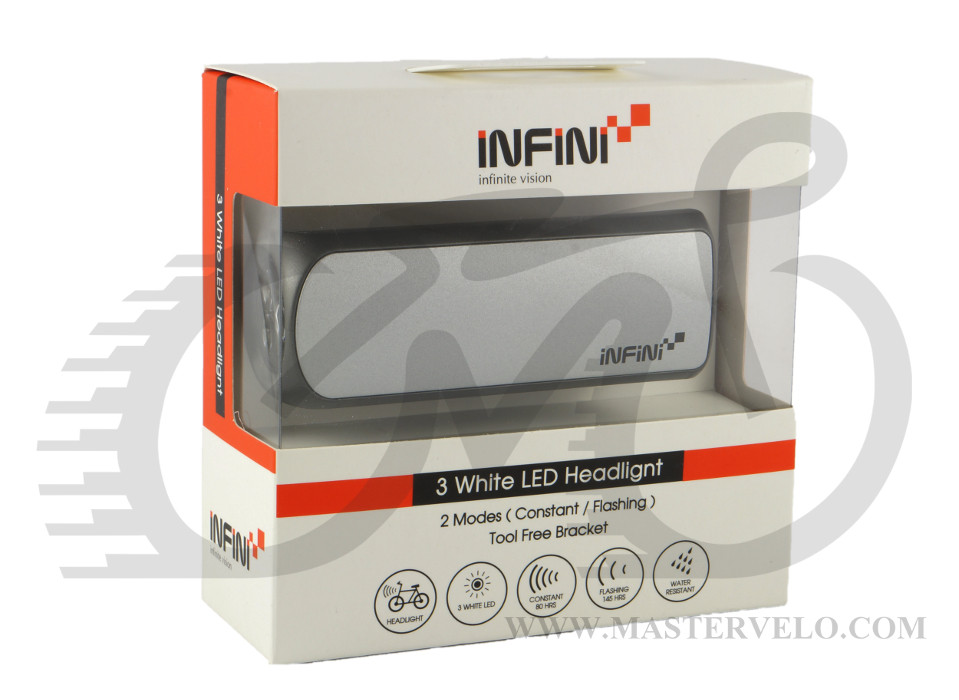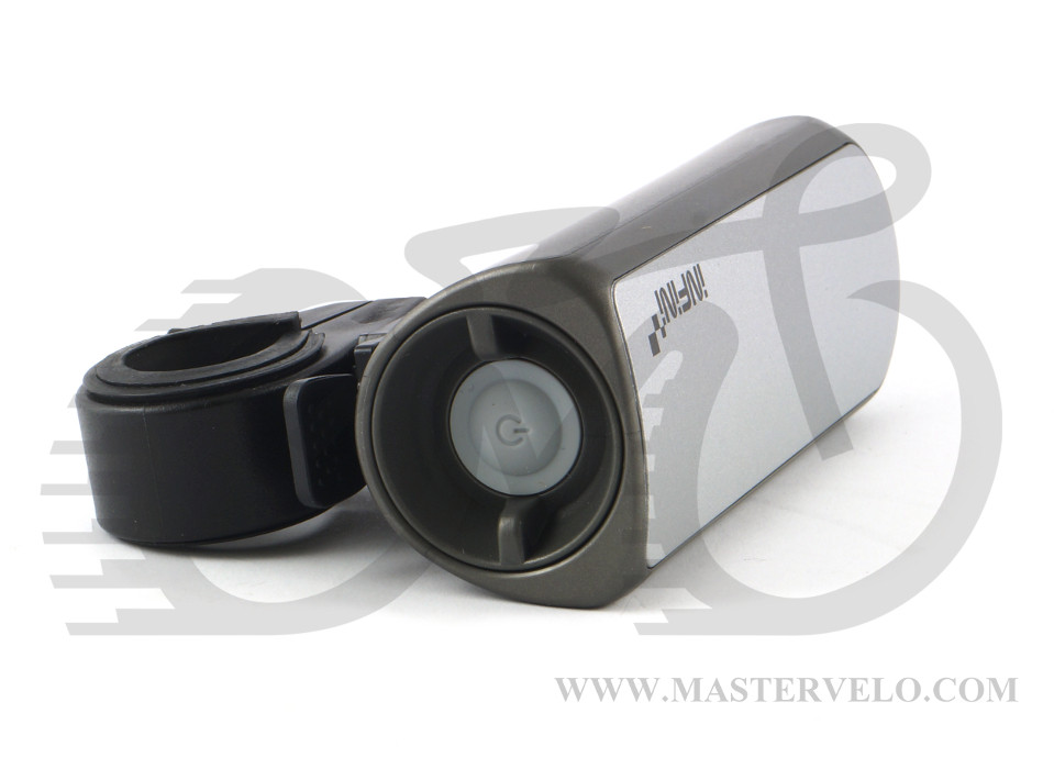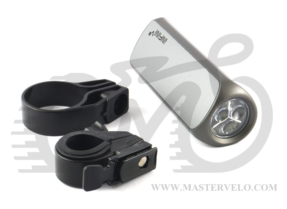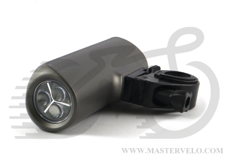 Передняя фара оснащена 3-мя белыми светодиодами, имеет крепление на руль с двумя резиновыми прокладками, что дает возможность установить фару на рули разного диаметра.