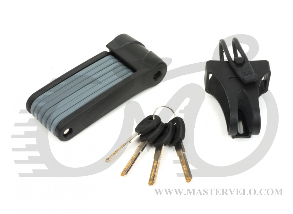 Замок-складной AUTHOR FLEXGUARD с стальными планками толщиной 3,5 мм и мягким покрытием предохраняющим краску на раме. Цылиндрический замок. В наборе 4 ключа. В комплекте крепление для фиксации замка на велосипеде. Длинна - 80 см. Вес 807 грамм.