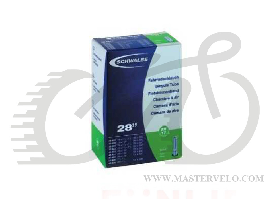 Велосипедная камера Schwalbe. Диаметр колеса: 28". Объем: 28-47 С. Тип нипеля: автомобильный (Schrader), длиной 40 мм.