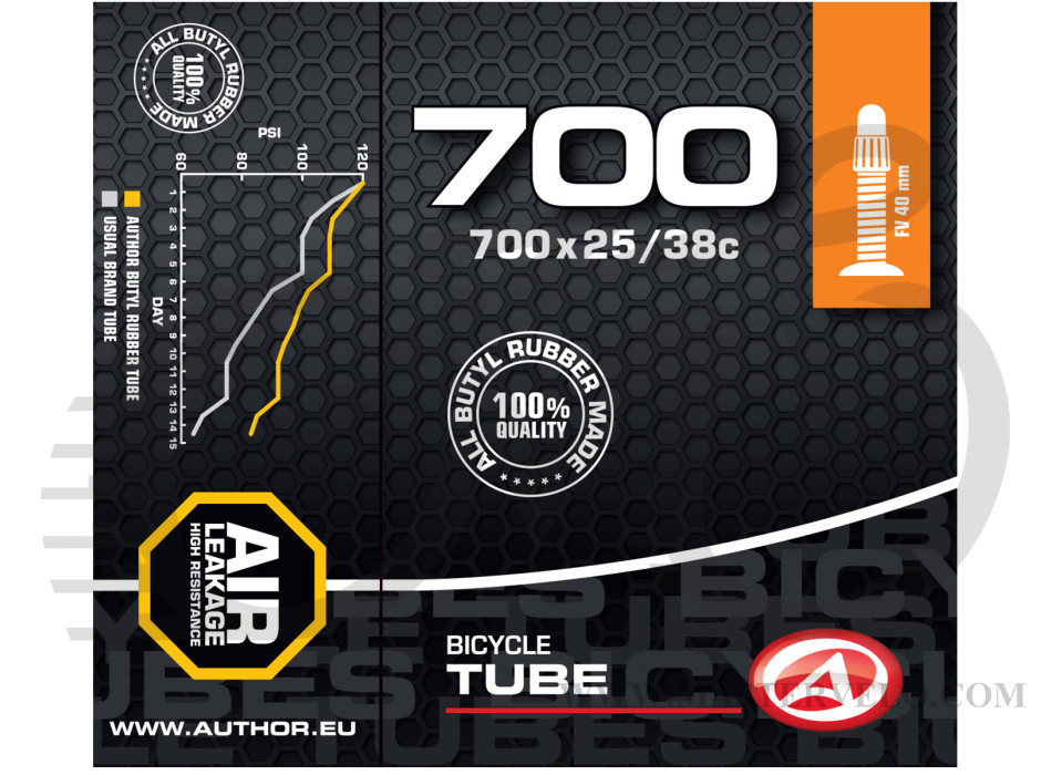 Велокамера Author CROSS-700C с французским ветилем FV высотой 40 мм, подходит для шин велосипедов 28x25/38C. Изготовлено из специального, 100% бутил каучука, который имеет очень низкую газопроницаемость. ETRTO 25/38-622/635. В коробочке, вес 140 гр.