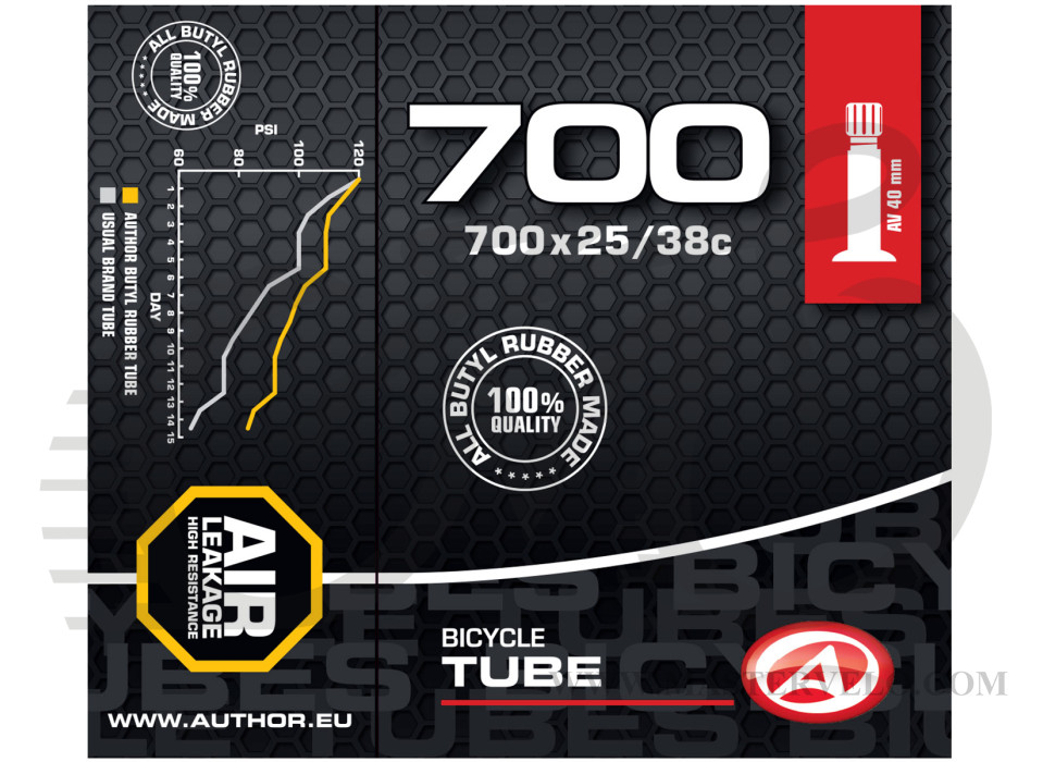 Велокамера Author CROSS-700C с автомобильным ветилем AV высотой 40 мм, подходит для шин велосипедов 28x25/38C. Изготовлено из специального, 100% бутил каучука, который имеет очень низкую газопроницаемость. ETRTO 25/38-622/635. В коробочке, вес 140 гр.