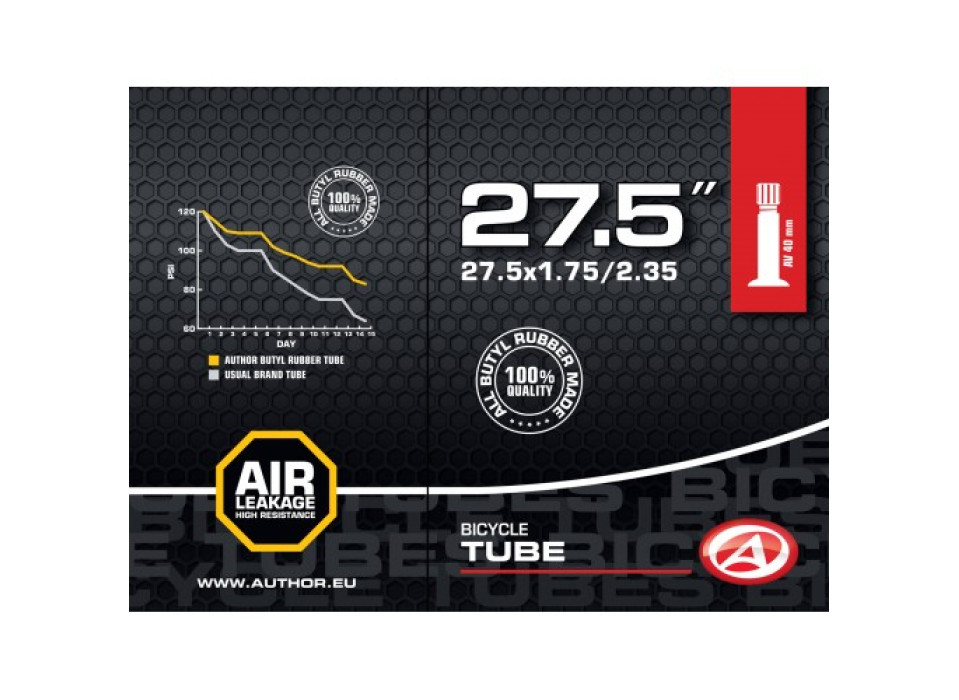 Велокамера Author AT-MTB-27,5" с авто ветилем AV высотой 40 мм, подходит для шин велосипедов 27.5x1.75/2.35. Изготовлено из специального, 100% бутилкаучука, который имеет очень низкую газопроницаемость. В коробочке, вес 195 гр.
