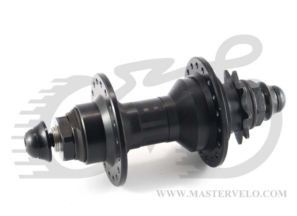 Задняя левосторонняя втулка MacNeil Blazer на промподшипниках. Корпус и 14 мм. ось изготовлены из алюминия 7075. В комплекте звезда 9Т. Количество отверстий: 36. Цвет: черный матовый.