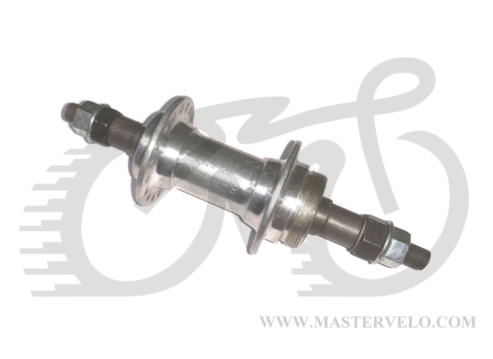 Втулка задняя под V-brake из алюминиевого сплава с резьбой под трещетку на 6-7-8 скоростей и под обод на 36 спиц. Крутящий момент обеспечивается шарикоподшипниками сепараторного типа, которые защищены от грязи и пыли стальными пыльниками. Крепление в раме на болтах.