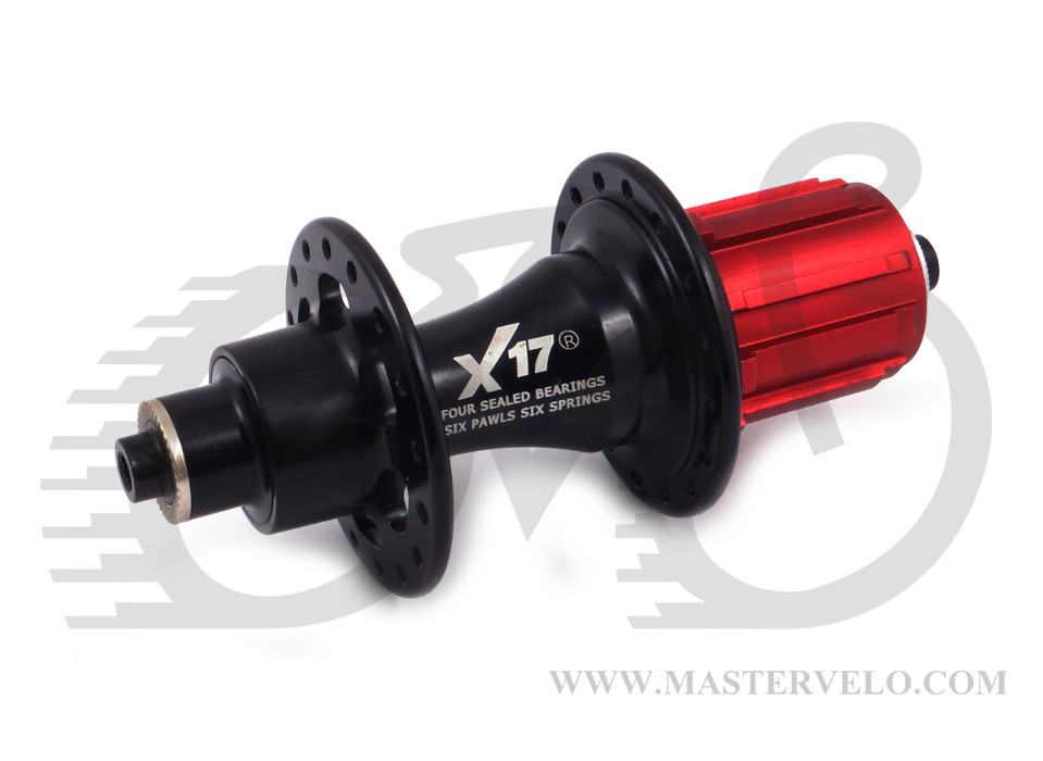 Задняя велосипедная втулка X 17 предназначена для использования на шоссейных велосипедах. Собрана на 4-х высококачественных промышленных подшипниках закрытого типа. Втулка имеет 6 собачек, алюминиевый корпус, барабан и ось изготовлены из алюминиевого сплава 7075, . Расстояние между дропаутами - 130 мм. Вес 0,285 кг.