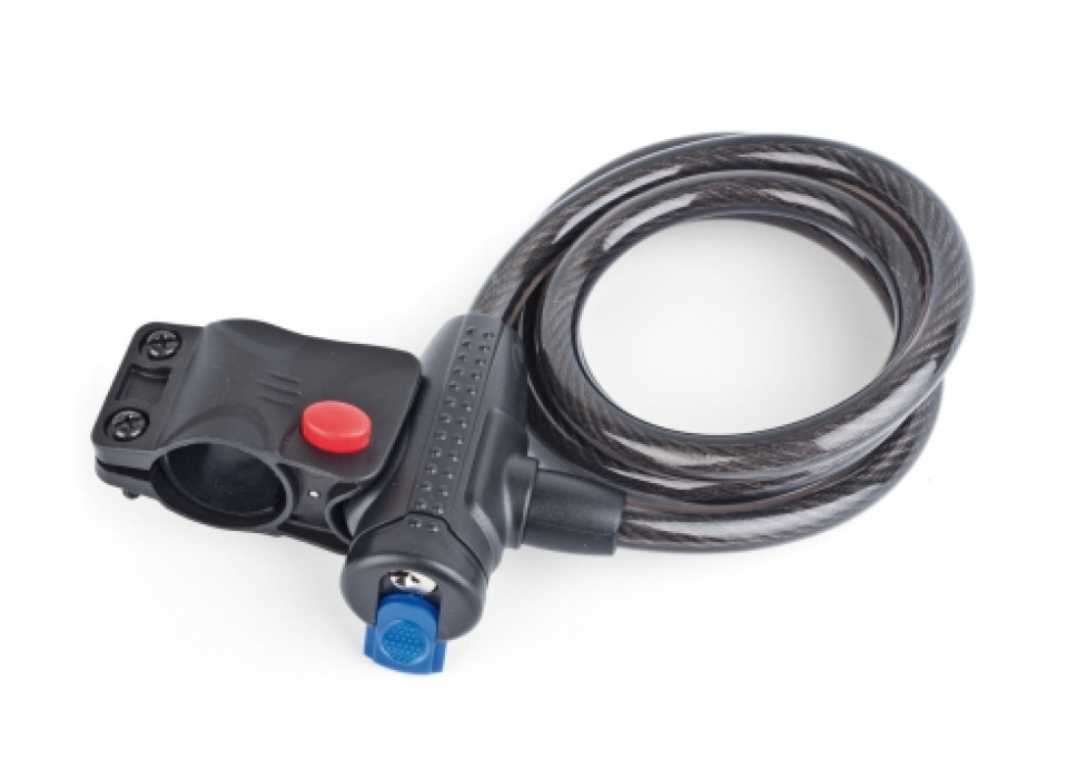 Замок ASL-45 закрывается на ключ и имеет затвор предохраняющий замочную скважину от попадания грязи и воды, стальной тросс имеет спиральную форму длиной 1200 мм и диаметром 12 мм.
