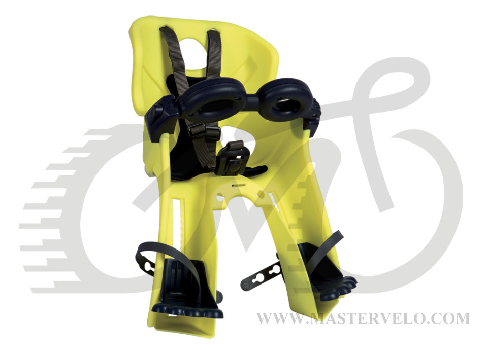 Переднее велокресло FRECCIA B-Fix, изготовлено из качественного пластика оснащено ремнями безопасности, их можно отрегулированы по высоте и длине. Пряжка легко защелкивается одной рукой и защитой для ног, которая предотвращает контакт ног ребенка с колесом в любых положениях. Перфорированная, вентилируемая комфортабельная спинка сидения. Крепление на руль (головная труба).