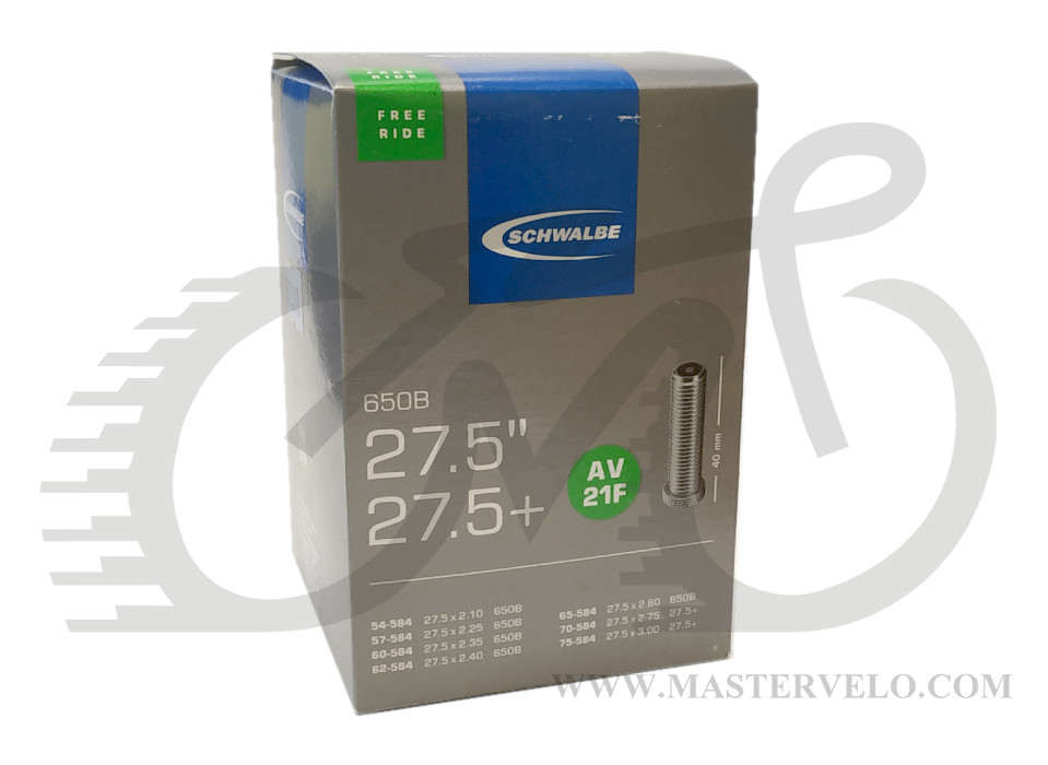 Камера Schwalbe av21F версии Freeride - оптимальное сочетание большого объёма и низкого веса. Высококлассная камера с классическими ниппелем автомобильного типа, подходит для колес размером 27,5". Отличается чрезвычайно хорошей мягкостью и долговечностью. Для исключения, каждая камера тестируется на заводе под давлением в течение 24 часов.