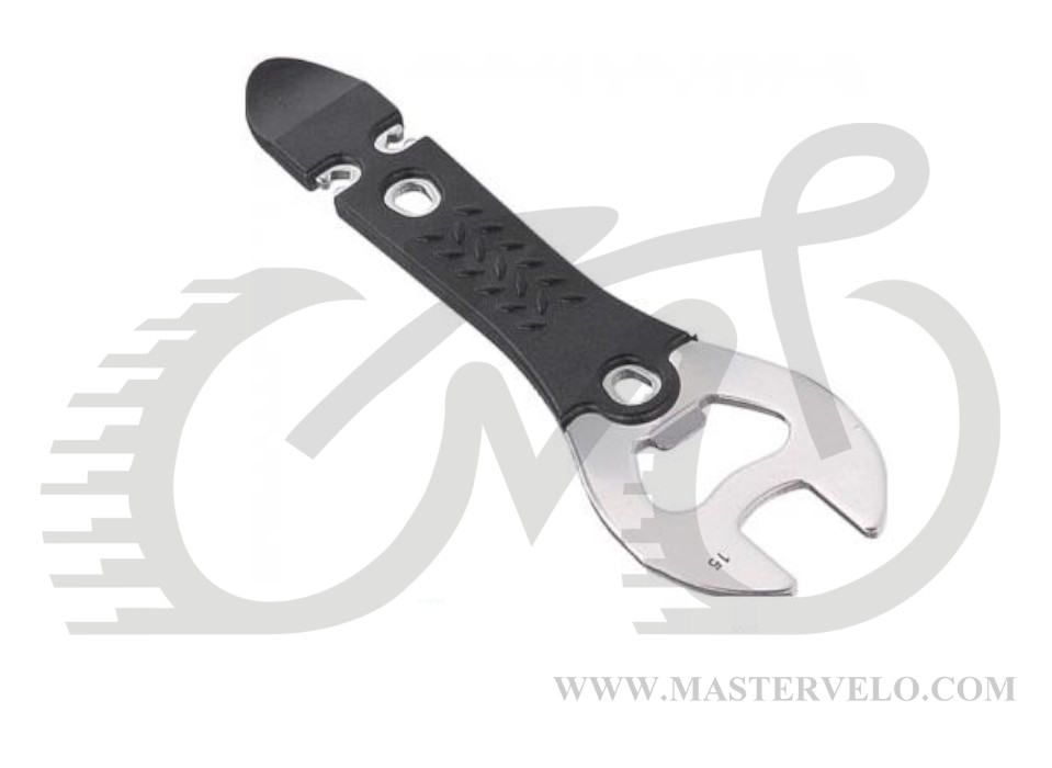 Педальный ключ Bike Hand YC-626 — ключ 4 в 1, включает в себя педальный ключ на 15 мм, открывалку для бутылок, ключи для спиц в ручке 3.2/3.5 мм, монтажку для снятия покрышек, а также имеет обрезиненную ручку и общую длину в 17 см.