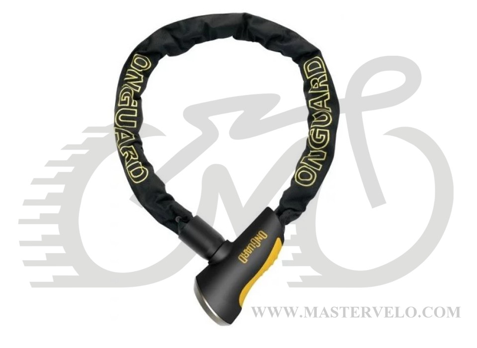 Производитель: Onguard. Мощный и надежный замок, основой которого является каленая стальная цепь с добавлением титана. В отличии от троса у цепи прочность выше и перекусить ее будет не так уж просто. У этого замка, звено имеет четырехгранную форму, что также повышает его сопротивляемость к возможному перекусыванию. Данная модель оснащена интегрированным противоударным замком на ключе. В комплекте поставляется пять лазерных ключей, один имеет подсветку для удобства пользования в темноте. Цепь находится в прочном чехле, что позволяет защитить Ваши руки, и лакокрасочное покрытие велосипеда.