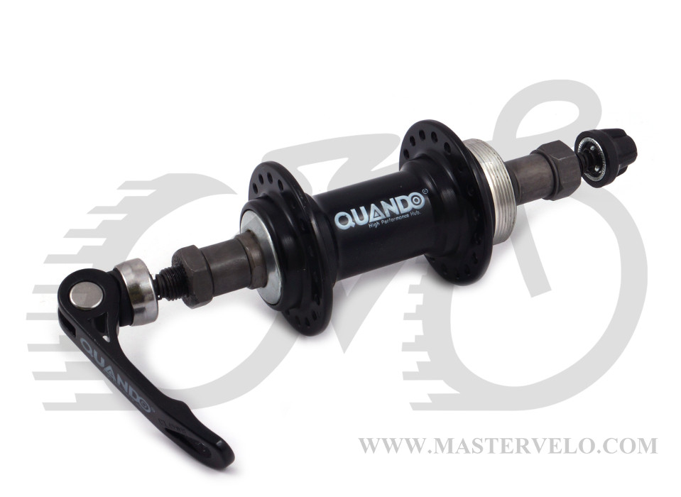 Втулка задняя из алюминиевого сплава с резьбою под терщетку на 7 скоростей и под обод на 36 спиц. Крутящий момент обеспечивается шарикоподшипниками сепараторного типа, которые защищены от грязи и пыли стальными пыльниками. Фиксация в дропаутах перьев рамы обеспечивается за счет эксцентрика. Длина оси 145 мм. Цвет черный.
