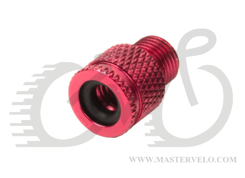 Алюминиевый адаптор-переходник для насоса AirStream для накачивания камер с французским типом нипеля FV. Имеет красный цвет и ребра на поверхности против проскальзывания пальцев при закручивании. Вес 2 грамма.