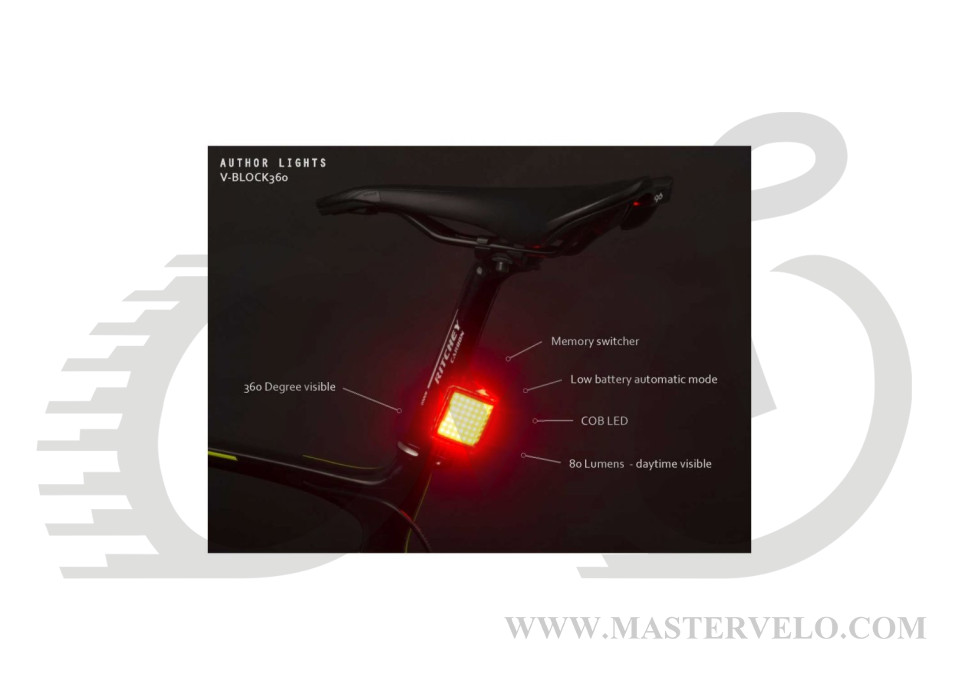 AUTHOR V-Block излучает невероятный световой поток на 360°, так что вас будет хорошо видно со всех сторон днем и ночью. С автоматической функцией Safe Ride Home вы получите 45 минут для безопасного возвращения домой. Высококачественная светодиодная технология COB вместе с другими функциями обеспечивают новый уровень безопасности.