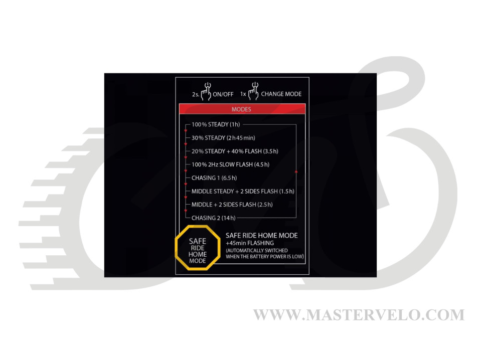 Автоматическая функция Safe Ride Home - когда заряд батареи становится низким, режим освещения автоматически переключается на медленное мигание, которое следует как минимум через 45 минут.
