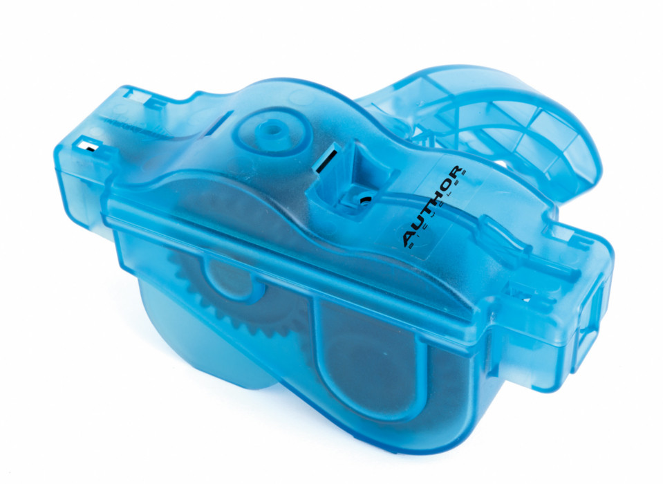 Эфективное устройство для очистки цепи AHT-810 с четырех сторонними щетками скребка, выполнено из прозрачного голубого пластика, вес 272 грамм