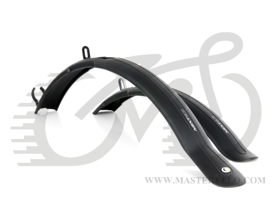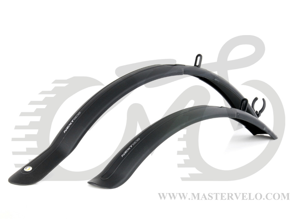 Классический комплект крыльев SIMPLA Next для горных велосипедов. Совместимы с тормозами v-brake. Под диаметр колес 24-28". Переднее крыло крепится болтом на гариллу вилки, заднее крыло - на подседельную трубу рамы и перемычку между задними перьями. Особенности: крепление на раму с коротким хомутом.