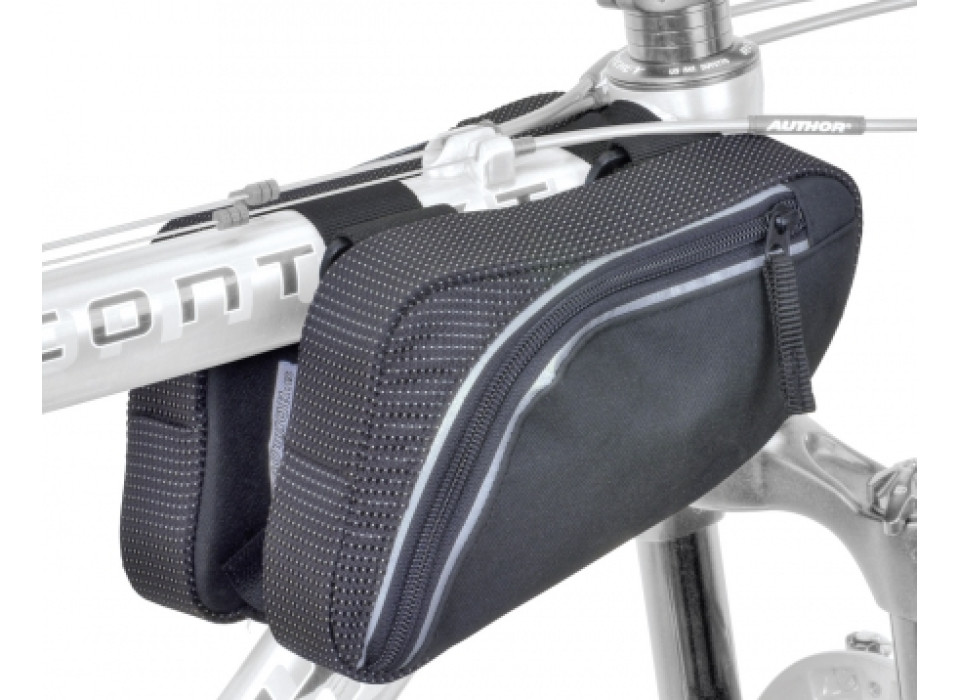 Универсальная сумка на раму, универсальная застежка Velcro позволяет надежно зафиксировать сумку в передней части треугольника рамы (подходит практически для всех типов рамы), 2 отдельных кармана (2x0,6л), мягкие прочные стенки. Светоотражающие полосы по периметру сумки. Вес 0,2 кг.