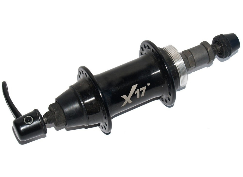 Втулка задняя из алюминиевого сплава с резьбой под трещетку на 6-7 скоростей под обод с отверстиями под 36 спиц. Крепление втулки к раме при помощи эксцентрика. Подшипники защищена от грязи и пыли резиновым пыльником. Цвет черный.