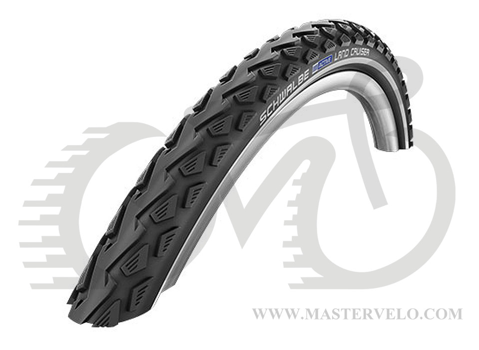 Дорожная шина LAND CRUISER от Schwalbe. Тихая на тротуаре. В то же время, благодаря ее четко выраженным боковым блокам протектора, шина обеспечивает достаточное сцепление при езде вне дороги.