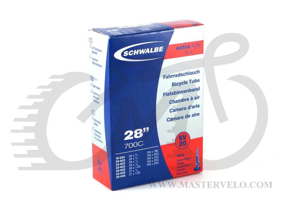 Суперлегкая и прочная велосипедная камера Schwalbe EXTRA LIGHT. Диаметр колеса: 28". Объем: 18-28 С. Тип нипеля: велосипедный (Presta), длиной 40 мм.