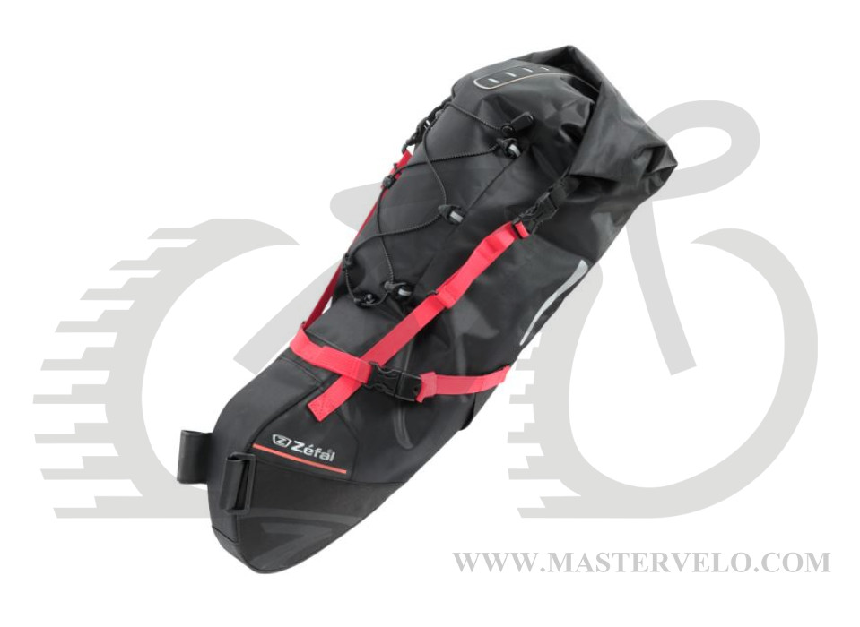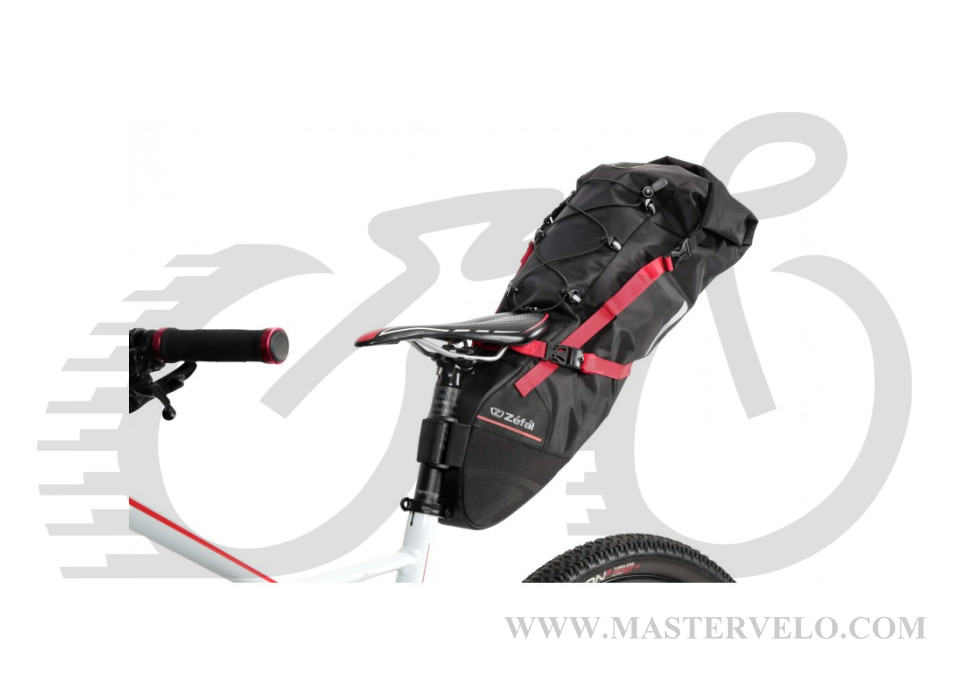 Сумка крепится прочными ремнями к рейлам седла и к подседельной трубе для оптимального распределения веса на велосипеде.