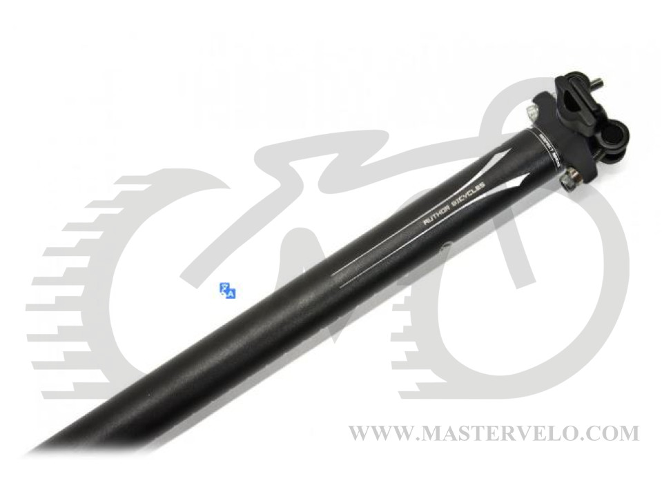 Подседельный штырь ACO-SP07 X8 изготовлен из алюминиевого сплава AL6061-T6, длинна трубы 400 мм, диаметр 31,6 мм, цвет: черный с белой продольной полосой и нанесенными логотипами Author. Вес 382 грамма.